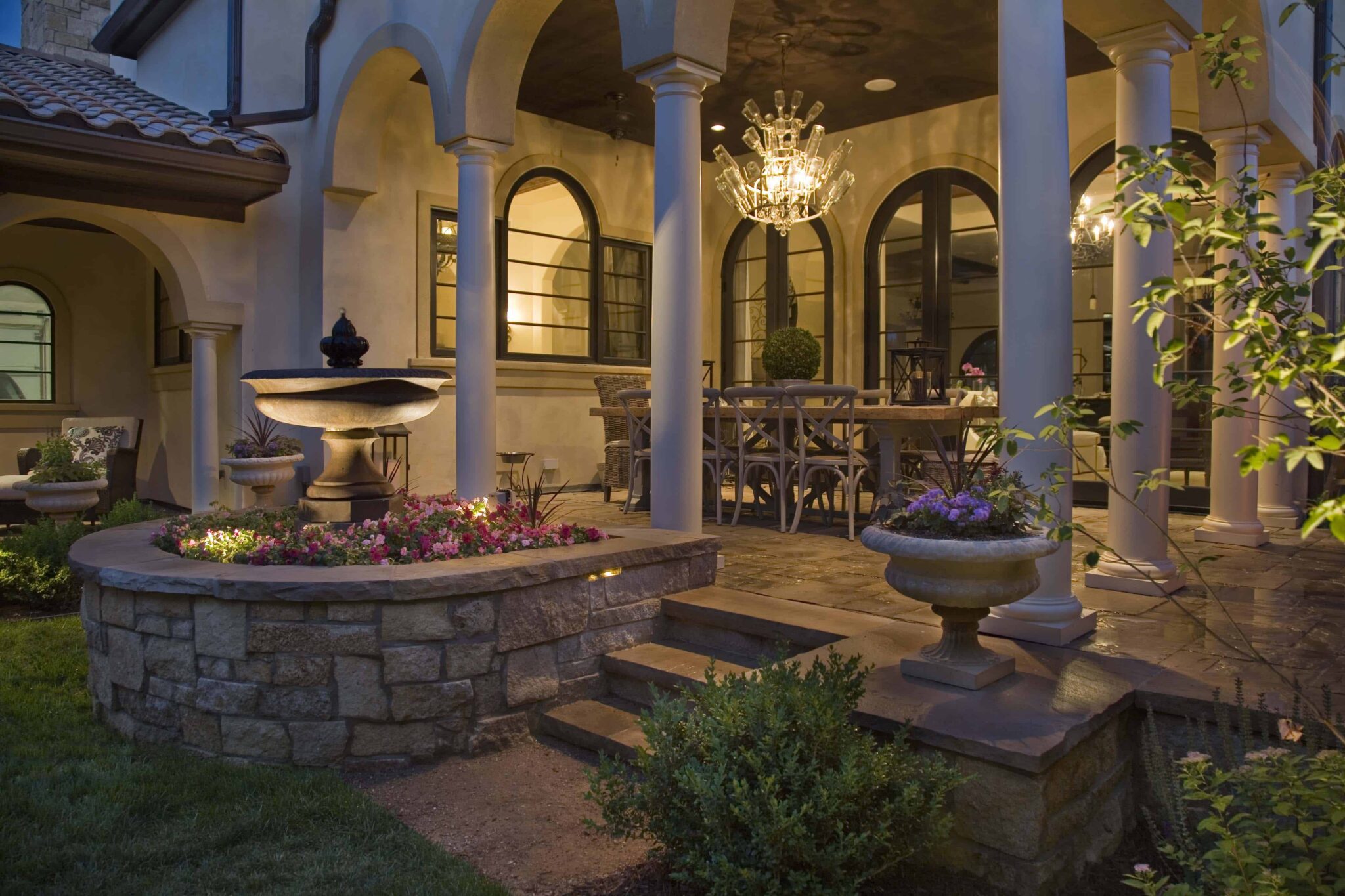 The outdoor room has been created with use of round Tuscan style columns, annual plantings in planters, and a paver patio. Ambient and mood lighting makes this outdoor space an enjoyable place to spend an evening simply relaxing or entertaining guests.